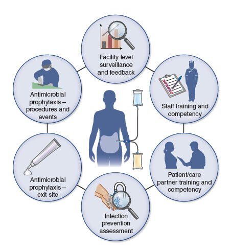 The peritoneal dialysis (PD) core interventions are practice recommendations designed to prevent infections associated with PD, including peritonitis, exit-site infections, and tunnel infections. These interventions serve as a framework for dialysis facilities caring for people undergoing PD. The interventions are grounded in current evidence and international clinical practice guidelines, with input from a diverse group of stakeholders.