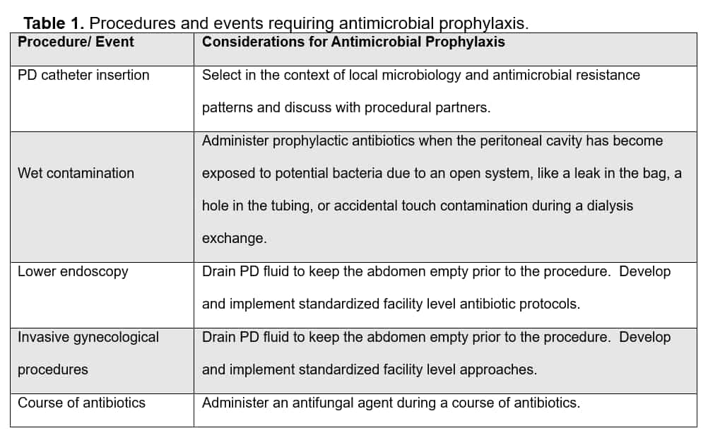 The implementation of standardized, program specific protocols may facilitate timely and uniform administration of prophylactic antimicrobials. Guidelines from ISPD recommend prophylactic antibiotics before PD catheter insertion, lower endoscopy, invasive gynecologic procedures, or after a wet contamination episode.1,18,38