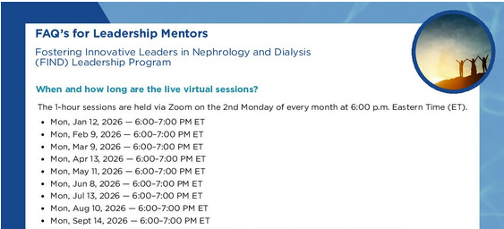 Fostering Innovative Leaders in Nephrology and Dialysis (FIND) is a leadership training program specifically focusing improving outcomes and experiences for people who are living with kidney diseases.