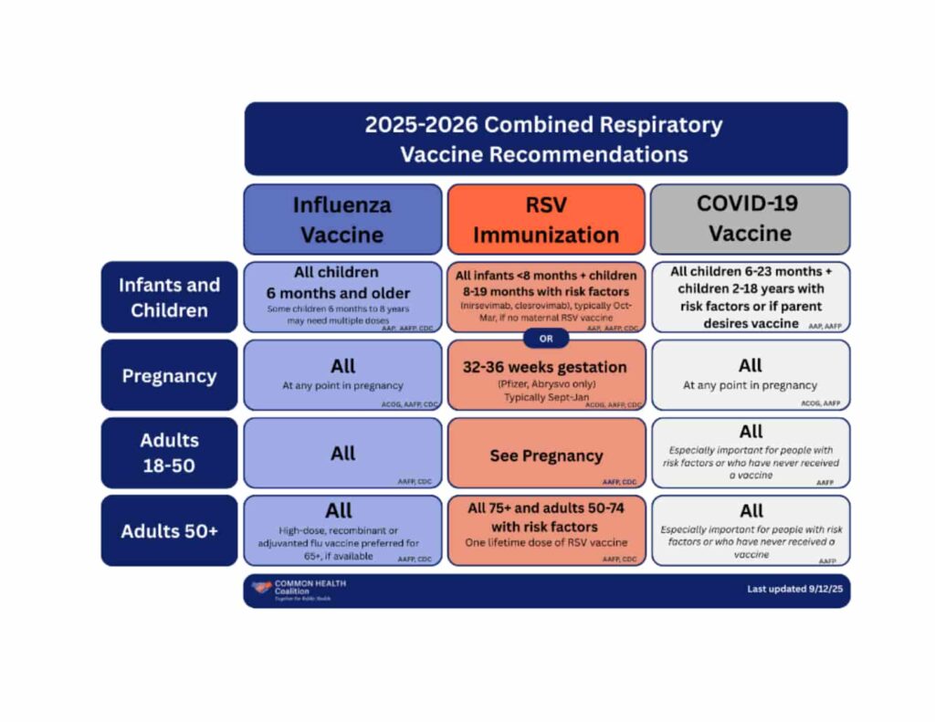 This table provides an aggregate summary of updated recommendations from various sources for flu, RSV, and COVID-19 vaccines for infants and children, pregnant people, adults 18-50, and adults 50+ based on the latest guidelines.