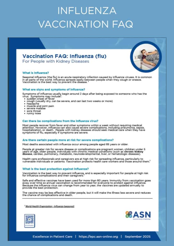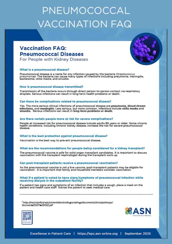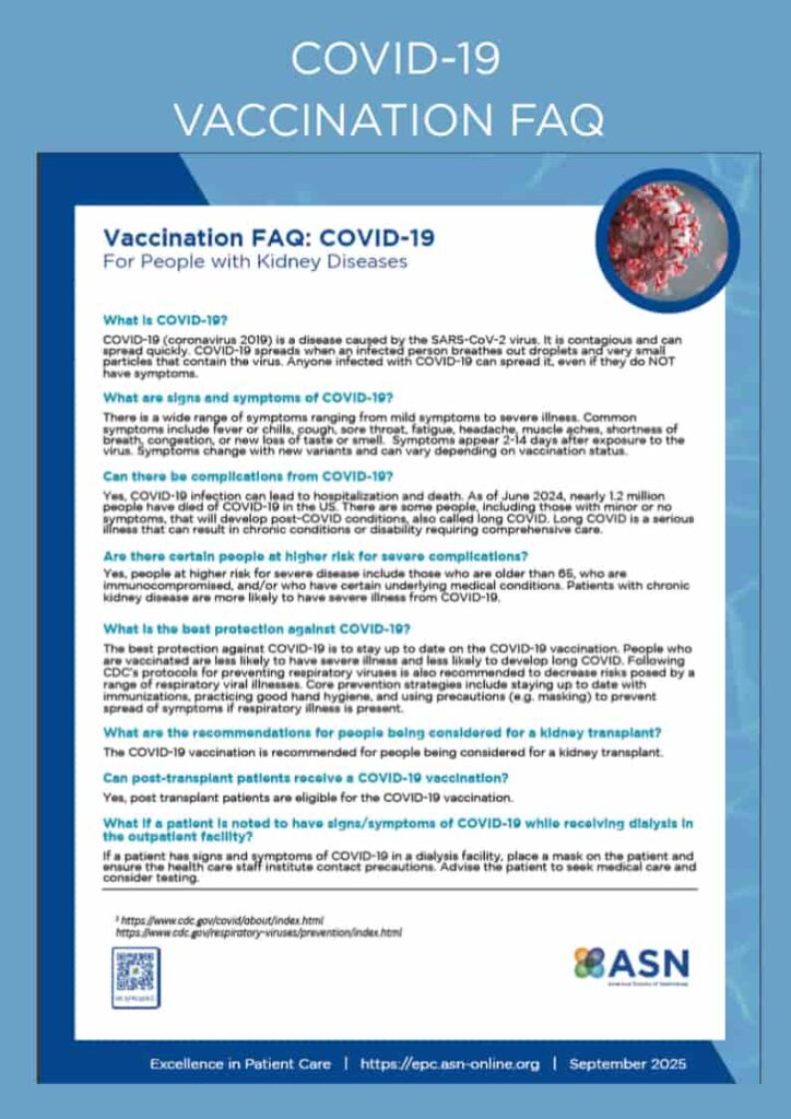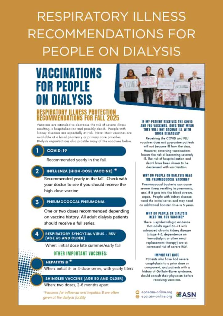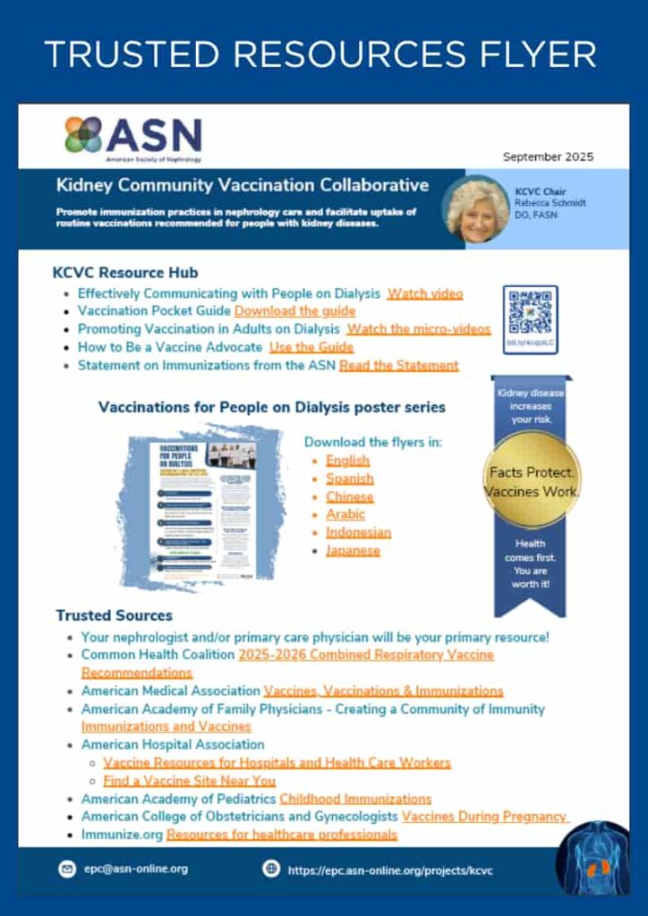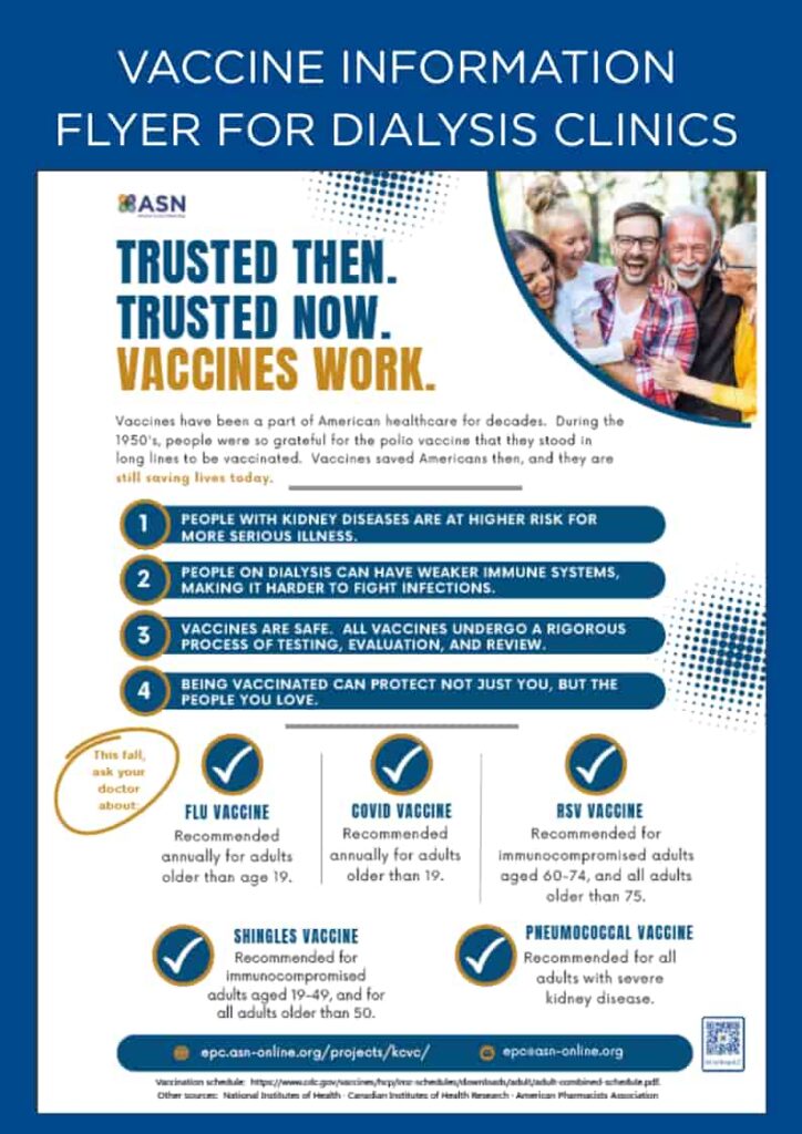 Vaccines are intended to decrease the risk of severe illness resulting in hospitalization and possibly death. People with kidney diseases are especially at risk. Please view the resources below for important information on vaccination for people with kidney diseases.