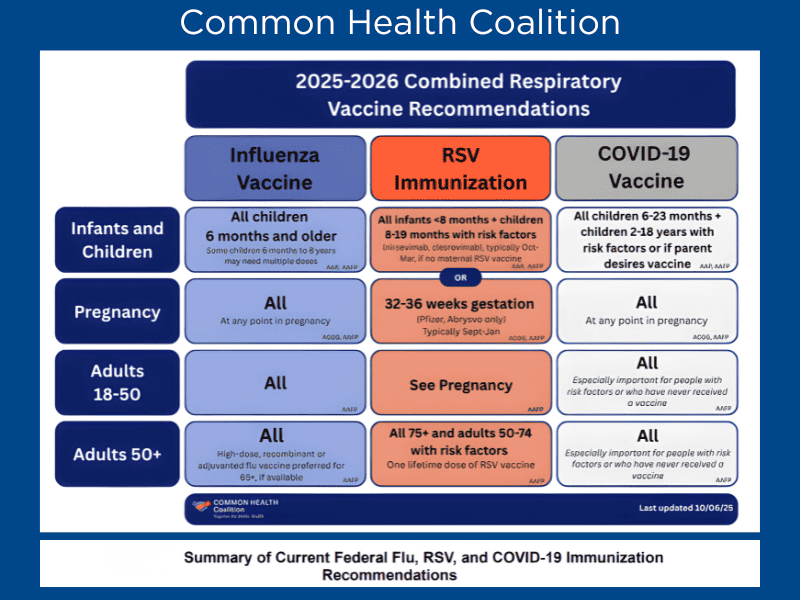 This table provides an aggregate summary of updated recommendations from various sources for flu, RSV, and COVID-19 vaccines for infants and children, pregnant people, adults 18-50, and adults 50+ based on the latest guidelines.